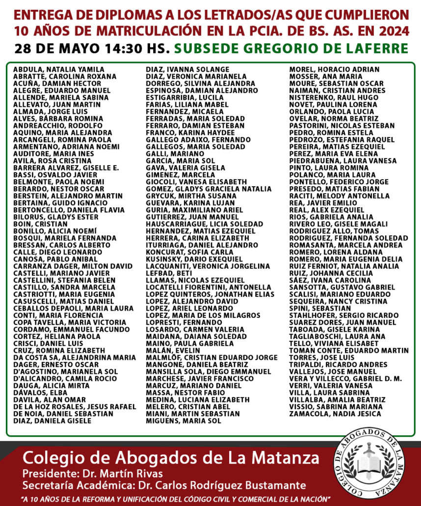 Invitamos a las y los matriculados al Acto Académico de entrega de Diplomas a los Colegas que alcanzaron 10 años de Matriculación durante el año 2024, el próximo Miércoles 28 de Mayo a las 14:30 hs. sita en la calle Honorio Luque 6023.